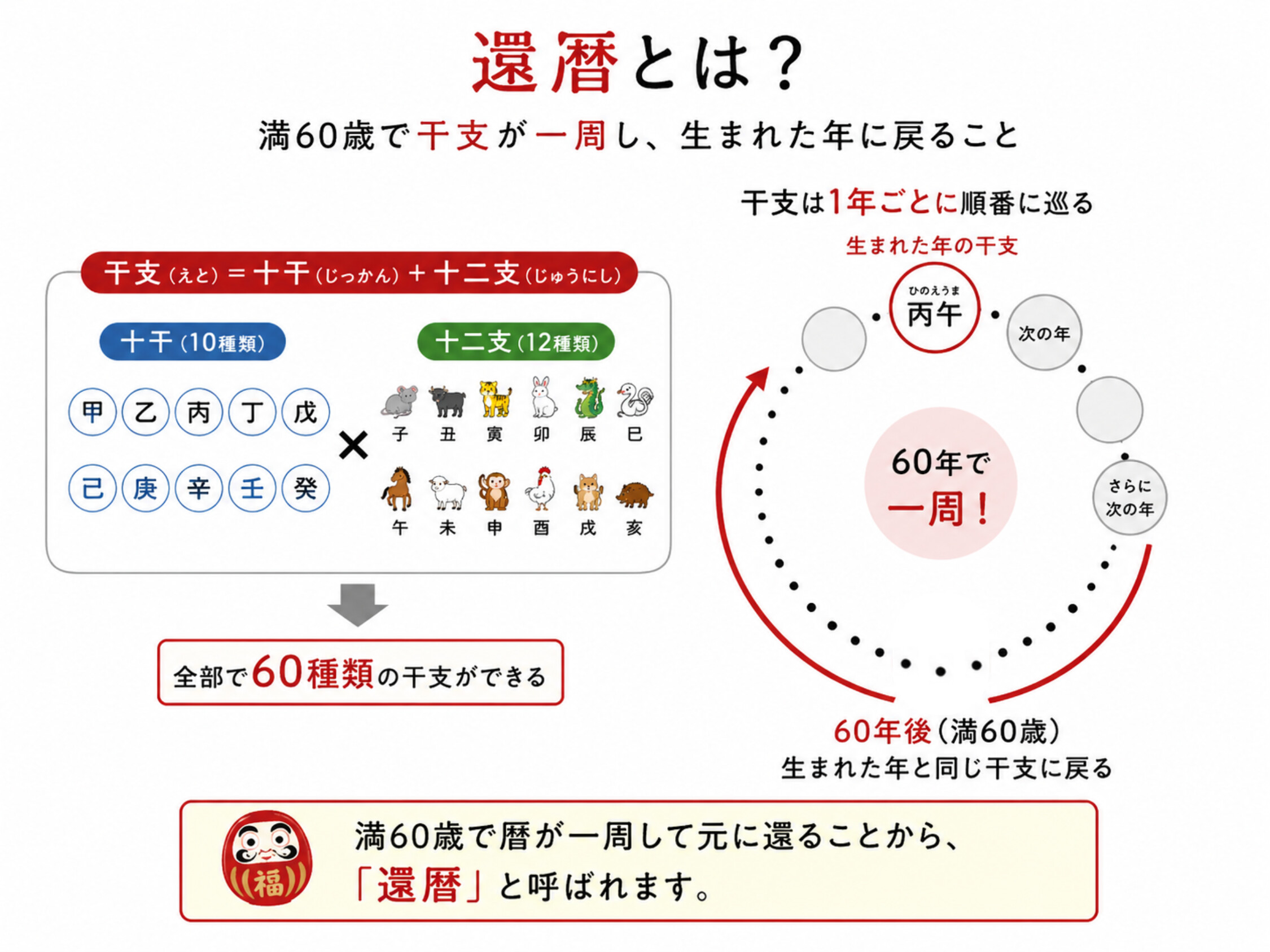 この60種類の干支が1年ごとに順番に巡っていくため、自分が生まれた年とまったく同じ干支が回ってくるのは、ちょうど60年後になります。つまり、満60歳を迎えたときに「暦が一周して生まれた年に戻る」というわけです。