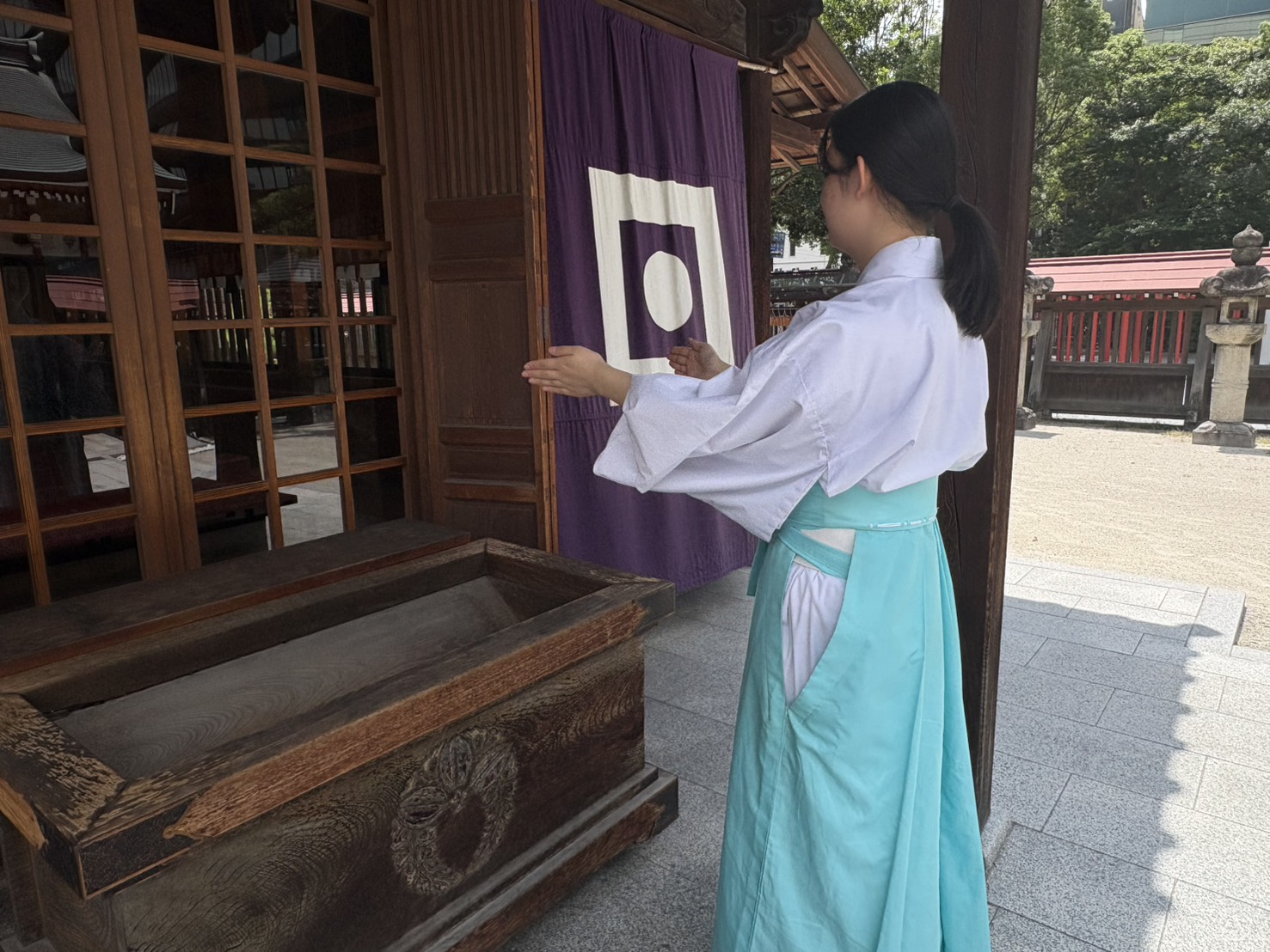 はじめに、賽銭箱の前で神様に向けて二回深いお辞儀をしましょう。